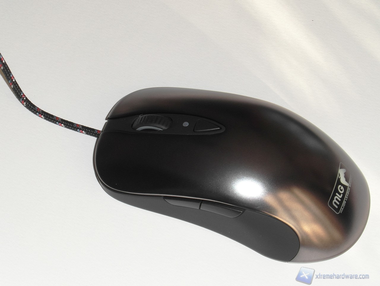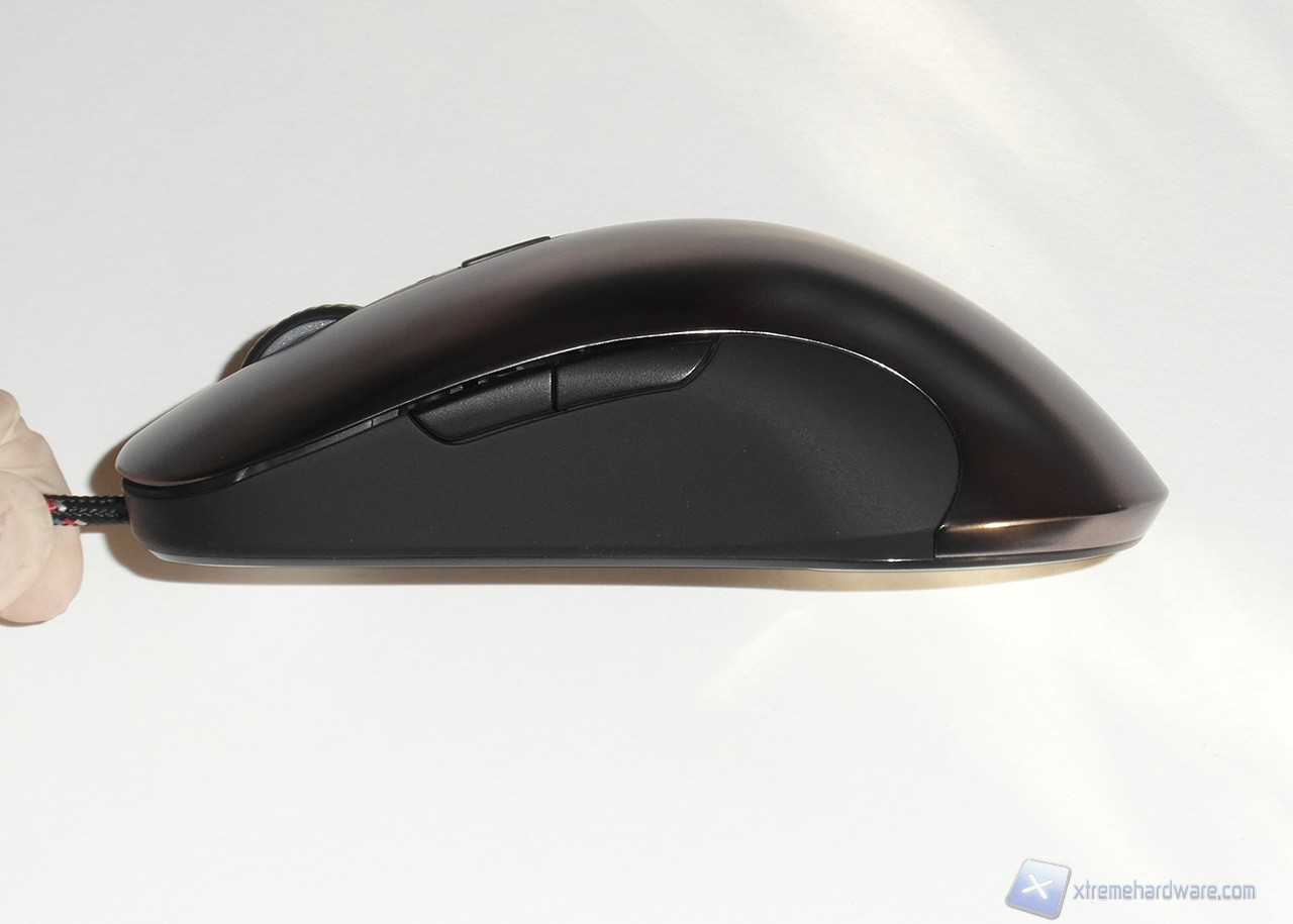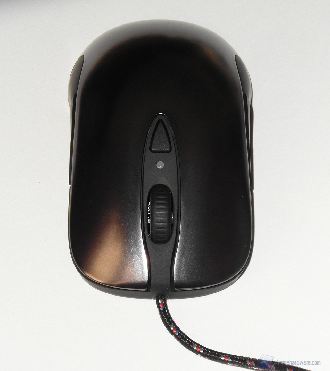 Il connubio di queste due superfici rende molto piacevole il mouse al tatto e alla vista, oltre a garantire un buon comfort e grip durante le sessioni di gioco. Il metallo infatti è trattato in modo particolare, opaco e non liscio, risulta molto meno scivoloso di quanto si possa immaginare. Dal vivo, la texture della parte superiore non risulta omogenea a causa del trattamento effettuato da SteelSeries, ma è decisamente bella da vedere.