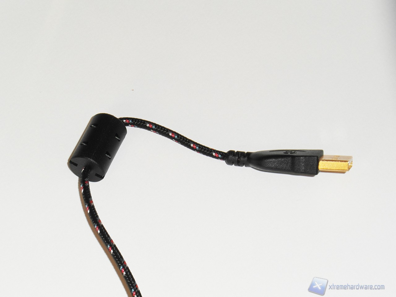 La seconda differenza estetica è data dal cavo, sempre in treccia di tessuto, ma con una trama che riprende i colori MLG (blu-bianco-rosso). Anche qui troviamo un filtro in ferrite anti-disturbo e il connettore USB placcato oro.