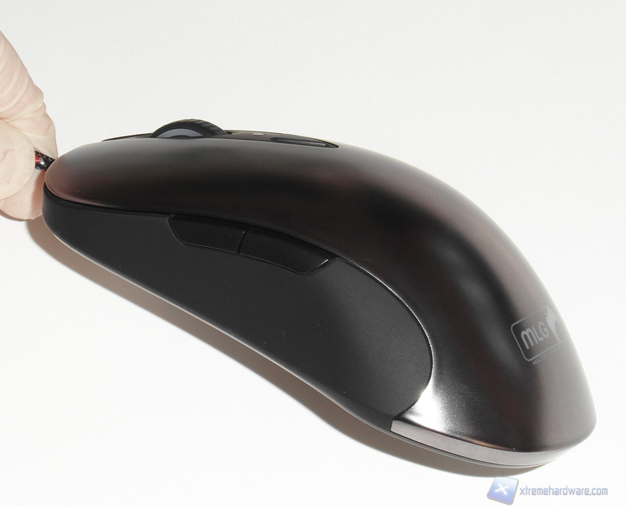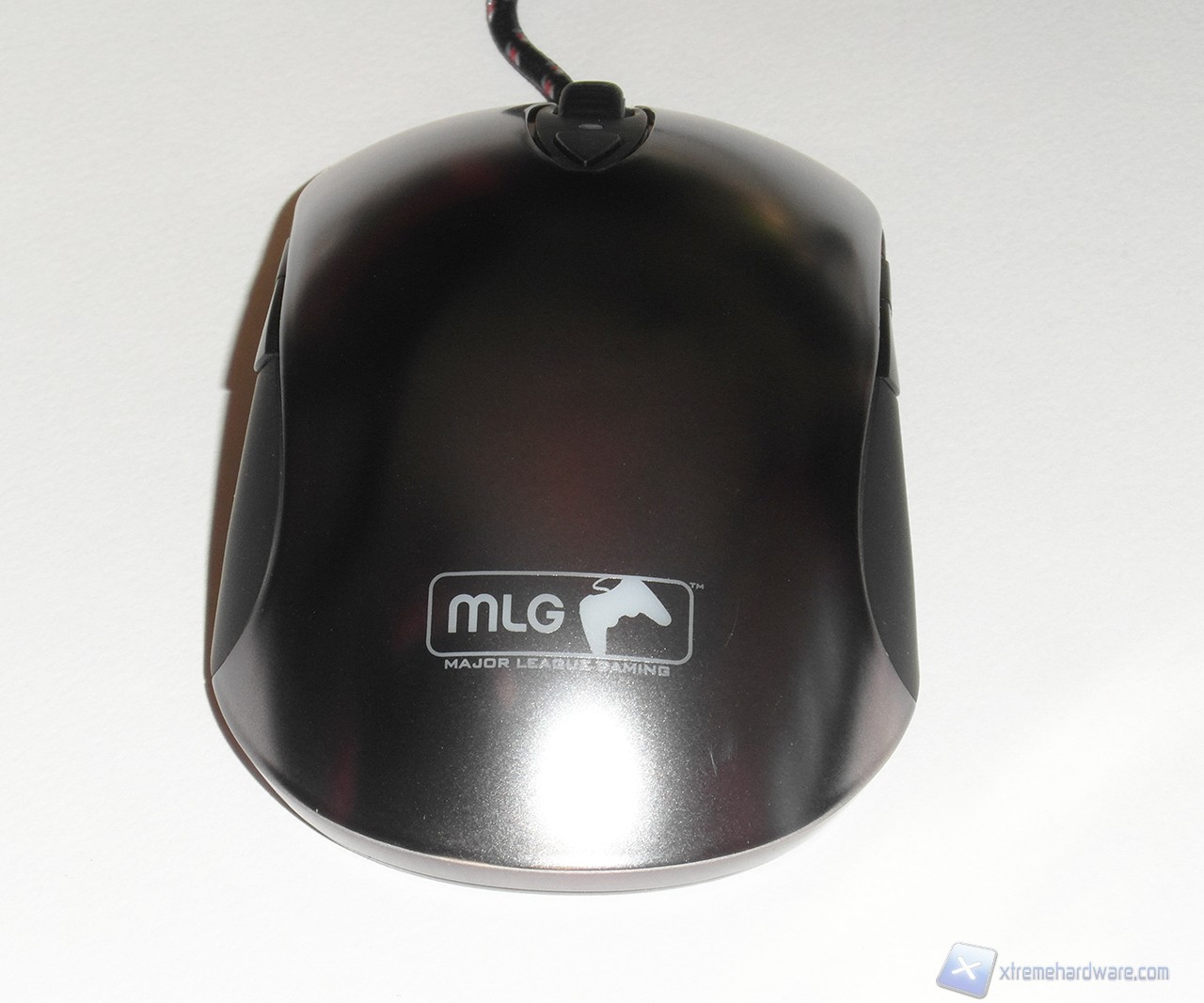 Una delle due differenze estetiche tra il nuovo e il vecchio Sensei è data dal logo MLG posto nella parte posteriore, in luogo del simbolo del produttore presente nella prima versione del mouse. Dalla foto possiamo inoltre apprezzare la simmetria e le linee dello stesso.