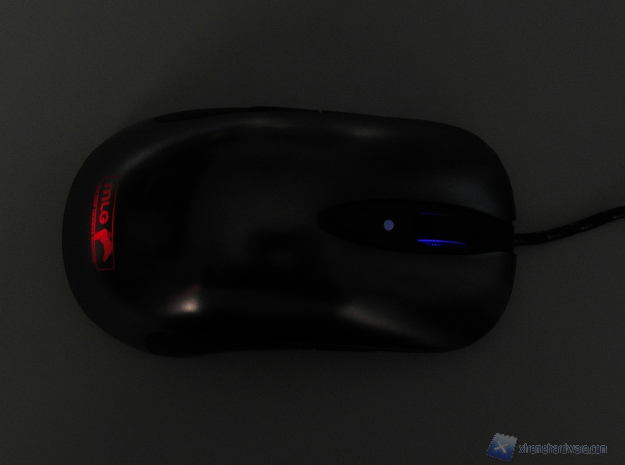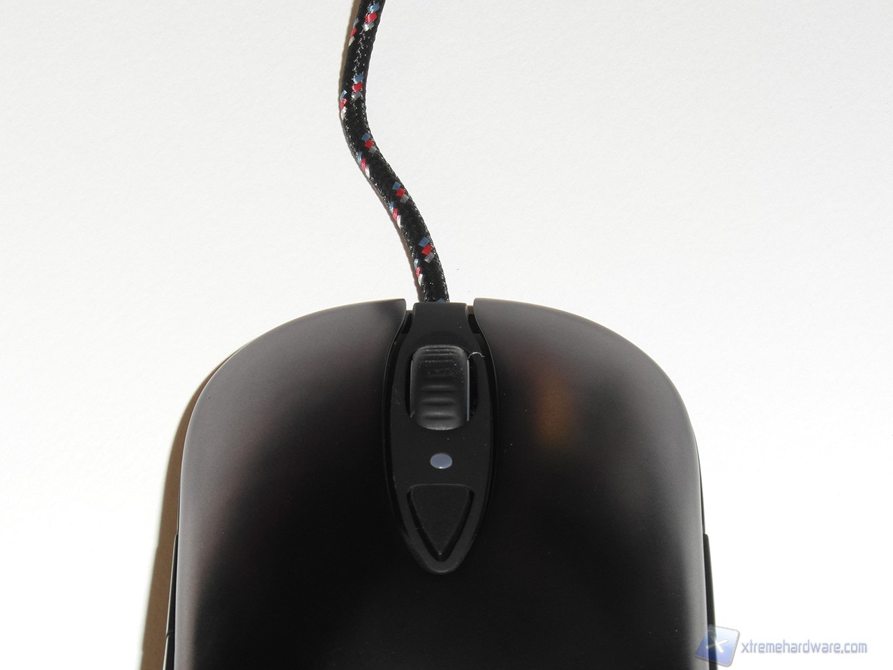 Anche la parte anteriore del mouse non presenta differenze significative, buono lo scroll (illuminato in modo indipendente) caratterizzato da un ottimo profilo seguito dal pulsante per l'interpolazione software con relativo LED di stato.