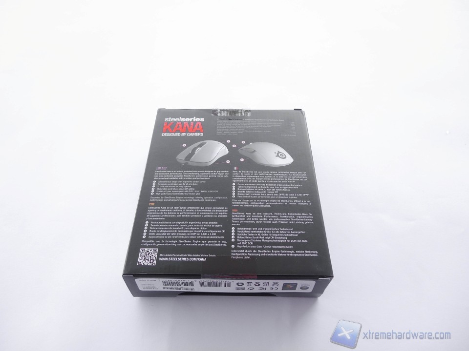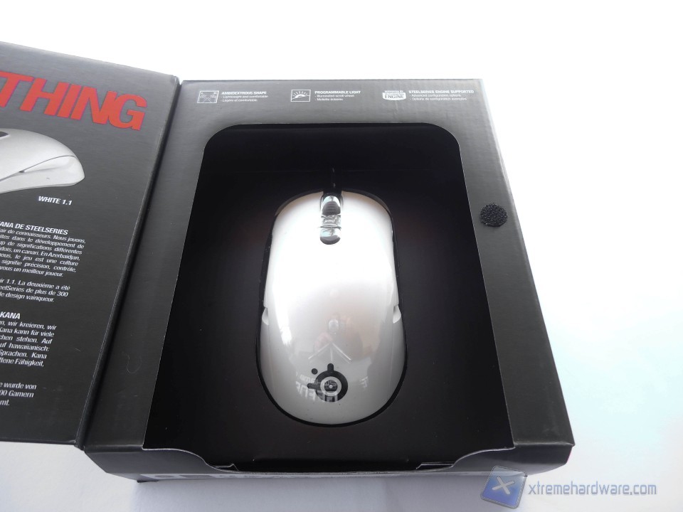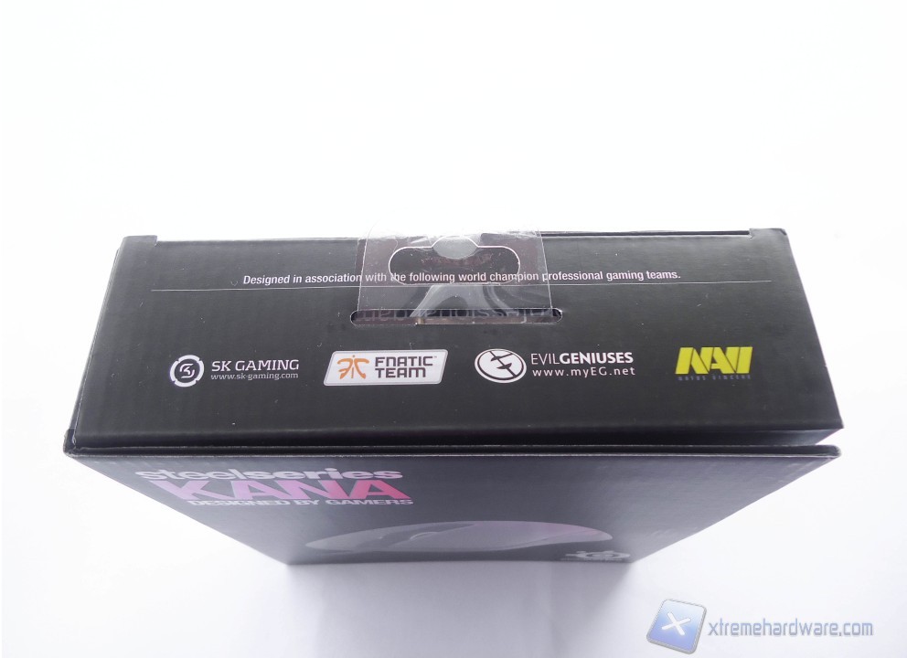 La confezione del Kana è in stile tipico SteelSeries, infatti, è di forma quadrata e presenta l’apertura a libro. Le dimensioni della scatola sono 20 X 17 X 5,5 cm e il colore prevalente è il nero. Sulla parte frontale troviamo l’immagine del mouse, in questo caso nella colorazione bianca e il nome del prodotto.