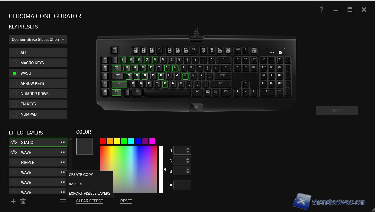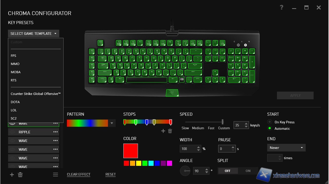Già con questi pochi effetti la Razer Blackwidow Chroma Stealth risulta essere ampiamente personalizzabile a seconda dei propri gusti, ma la vera chicca risiede nel Chroma Configurator un vero e proprio ambiente di “sviluppo” e creazione di nuovi effetti. Selezionando il profilo “Custom” e cliccando su “Chroma Configurator” accederemo ad un nuovo pannello dal quale avremo la possibilità come prima cosa di creare effetti grazie ai pattern ed alle funzioni di gestione, ma anche di importare nuovi script creati da altri utenti o da amici, o ancora di creare una copia di “backup”. Nel video che abbiamo realizzato e che inseriremo alla fine di questo capitolo possiamo ammirare la vastità di effetti e personalizzazioni offerteci dal software. Razer da sempre collabora con i gamer ed è per questo che sempre nel Chroma Configurator ha inserito dei preset di effetti/tasti che, come vedremo dalle immagini, permetteranno a seconda del profilo/gioco scelto di illuminare solo determinati tasti con i colori che più saranno di vostro gradimento. Alcuni esempi di quello che troviamo sono i profili per Counter Strike, per DOTA, per LOL o per Starcraft II oltre che quelli generali per FPS, MMO, RTS e così via. Davvero un impressionante lavoro da parte di Razer e da tutti coloro che ogni giorno offrono gratuitamente nuovi script di effetti da poter caricare nella propria Blackwidow Chroma.