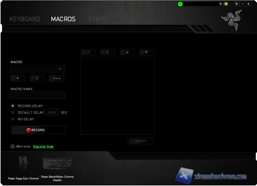 Il primo Menù si è concluso, passiamo dunque al Menù “Macro” nel quale potremo creare le nostre Macro e caricarle nei tasti dedicati da M1 a M5 presenti nel lato sinistro della nostra Blackwidow Chroma Stealth. Come detto anche per il mouse, il software Razer Synapse offre un ambiente di creazione Macro ottimale per crearle facilmente e senza troppe complicazioni. Potremo inserire o meno un delay tra la pressione dei tasti o eseguire e registrare la macro “pura” così come noi la stiamo eseguendo o ancora senza nessun delay. A differenza del Naga Epic Chroma o di altri mouse in questo caso la Blackwidow ha dei tasti che ci permetteranno di registrare e creare una macro On-the-fly direttamente in gioco e salvarla per poi caricarla all’occorrenza in gioco. Possibilità come sempre di creare varie macro, copiarle, cancellarle ed editarle facilmente. Cosa possiamo chiedere di più?