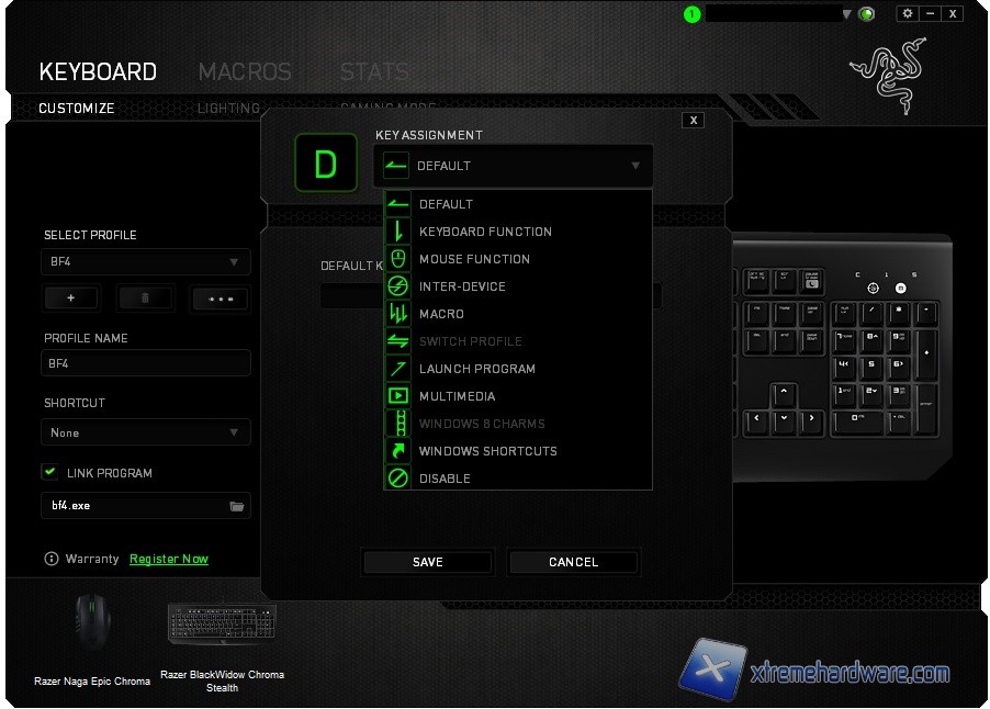 Partiamo dunque dalla tab “Customize” dove come per il mouse avremo modo di selezionare ogni singolo tasto presente sulla tastiera ed assegnargli una funzione ben precisa, ad esempio l’avvio di un programma, una macro, un tasto di riproduzione multimediale e via discorrendo. Non manca la possibilità di creare vari profili da caricare all’occorrenza ed anche in questo caso di “linkarli” direttamente ad un programma o gioco in modo che vengano caricati in automatico senza dover sempre aprire e agire via Synapse. Menù come sempre intuitivo e veloce.