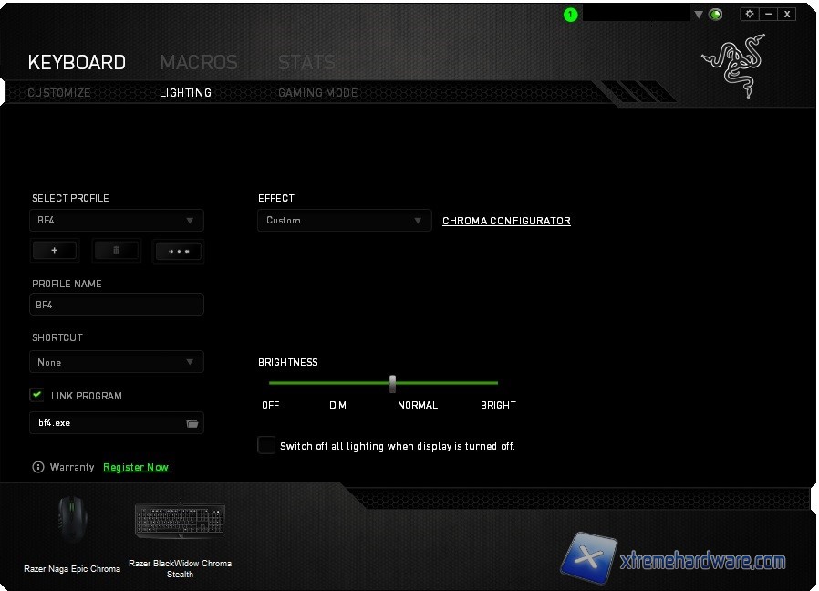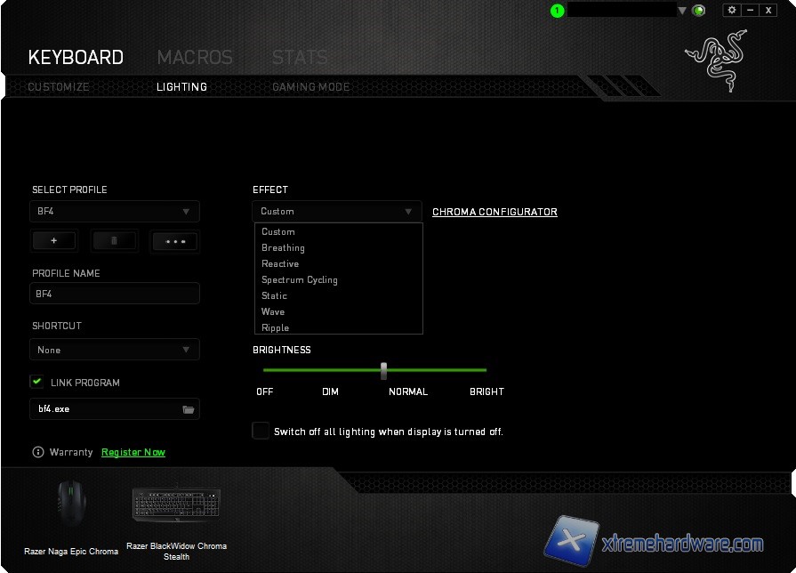 Spostandoci nella tab “Lightning” arriviamo al cuore essenziale di questa tastiera e cioè l’illuminazione. Per chi avesse seguito qualche volta i forum Razer, avrà notato come siano stati creati moltissimi effetti visivi grazie al contributo della community Razer e dei relativi fan. Qui il software Razer Synapse ci mette innanzitutto a disposizione la possibilità di scegliere uno dei 7 profili precaricati. Nel dettaglio troveremo di default i seguenti effetti: