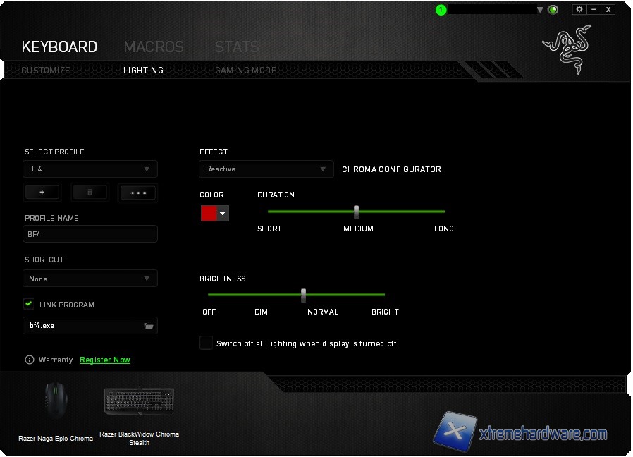 - Reactive (Reattivo) la tastiera sarà completamente priva di illuminazione che si attiverà per ogni singolo tasto che noi premeremo. Anche qui potremo selezionare il colore oltre che l’intensità luminosa tra tre step Short, Medium (di default), High.