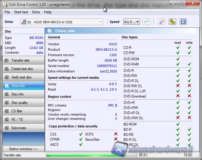 Abbiamo utilizzato Optdrive Control 1.50 per verificare tutte le caratteristiche del lettore come potete vedere qui di seguito: