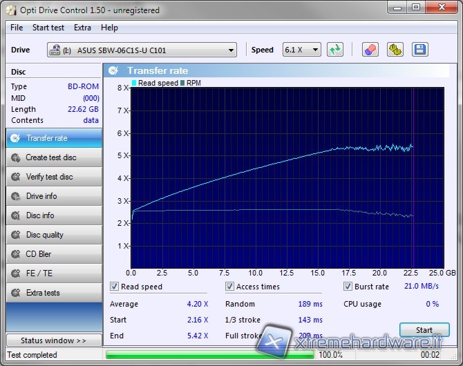 Il test di lettura del BD ha dato dei buoni risultati, con la velocità di lettura costantemente in aumento fino ad un massimo di 5.42x, quella di rotazione si è mantenuta quasi sempre costante a circa 2.5x.