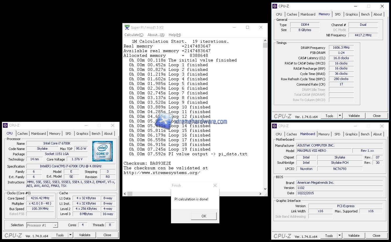 La Maximus VIII Hero presenta due profili di overclock automatico per la CPU Core i7 6700K, denominati TPU I e TPU II. Quest'ultimo propone come frequenza target per il cosiddetto Daily Use (considerando un giusto equilibrio tra temperatura raggiunta dal processore e voltaggio richiesto) di 4600MHz ma forte del vantaggio offerto dal processo produttivo introdotto da Intel a 14nm possiamo asserire che a chi capita una CPU fortunata nel periodo invernale la si può tenere anche a 4700 MHz. Comunque, il punteggio ottenuto è frutto dell’insieme processore/memorie per riuscire a dare il massimo senza perdere in stabilità. Nel nostro caso, grazie ad una CPU particolarmente fortunata, abbiamo potuto effettuare tutti i test ad una frequenza di 4800 MHz con 1,4V di Vcore. Per le memorie potevamo spingerci oltre, ma per l’utilizzo quotidiano abbiamo preferito non esagerare anche con i voltaggi e fermarci alla frequenza di 3212 MHz. Prossimamente vi proporremo la recensione del kit della G.SKILL utilizzato. Ecco a seguire gli screen che si commentano da soli e che se confrontati a pari frequenza a quelli pubblicati sul noto sito di Overclock Hwbot.org possiamo asserire che la Maximus VIII Hero alla frequenza di 4800 MHz si è comportata da vera fuori classe riuscendo a tirare a dovere il comparto CPU e RAM.