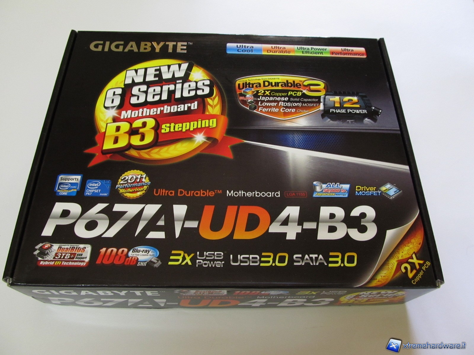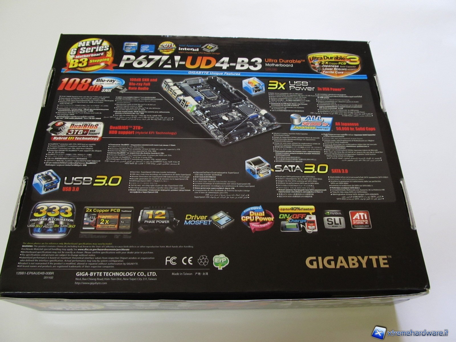 La scheda madre giunta oggi in redazione si presenta nel classico box di cartone. Nella facciata principale riporta, oltre ai vari loghi relativi alle caratteristiche della scheda anche, il logo B3 che ci ricorda della nuova release del chipset Intel P67. La release B3 corregge il noto problema all’interfaccia Sata 3Gb/s.