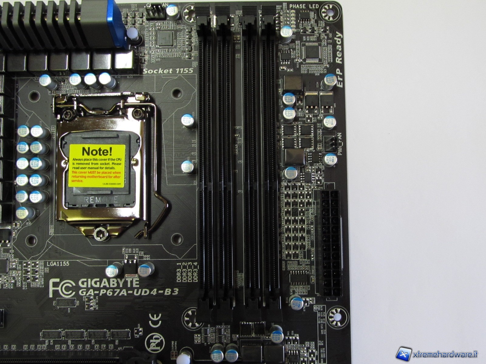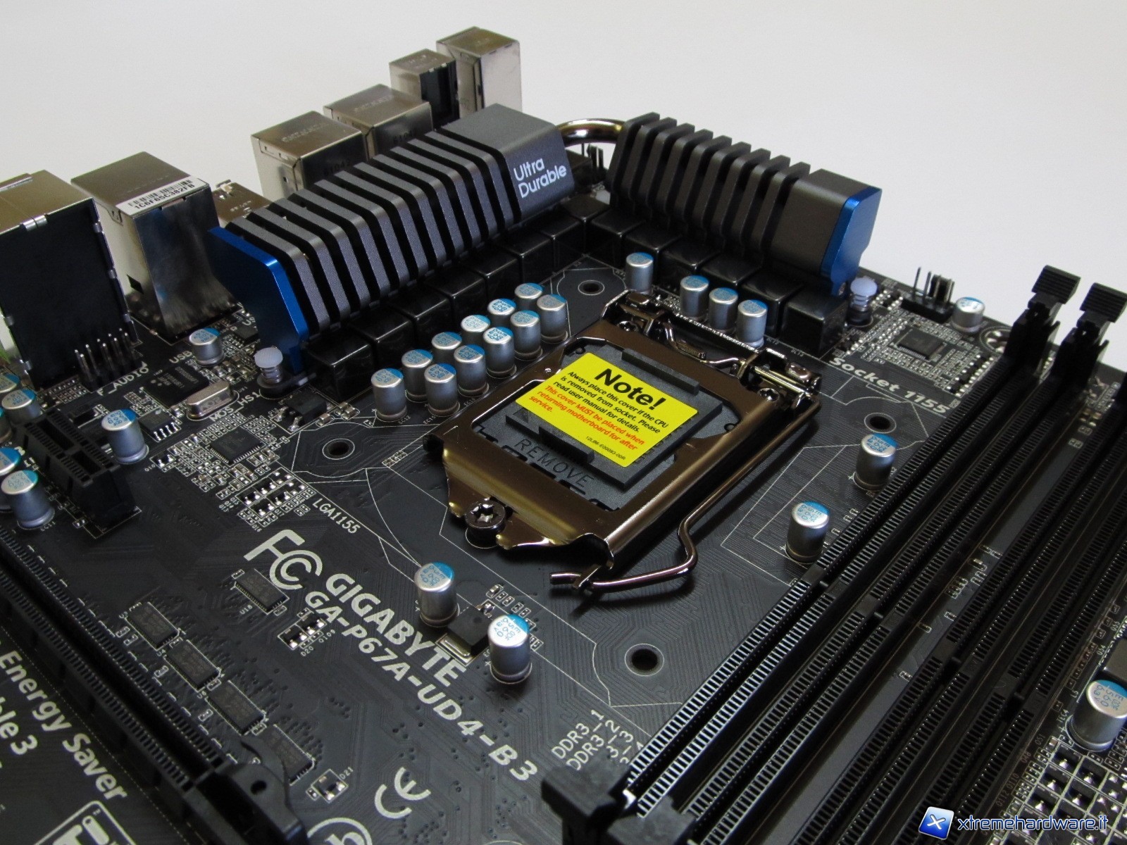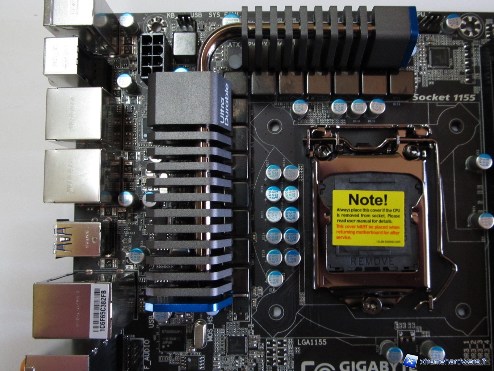 Nelle fotografie seguenti poniamo attenzione alla zona socket (LGA-1155); piuttosto imponente risulta essere il sistema di dissipazione dei Driver Mosfet, i vari condensatori che sono situati a corollario del socket e le fasi di alimentazione; particolare attenzione va riposta nel connettore da 8pin riservato all’alimentazione del processore, in questo caso segnaliamo una leggera problematica nel connettere l’alimentazione vista la sua vicinanza rispetto al sistema di dissipazione dei Mosfet.