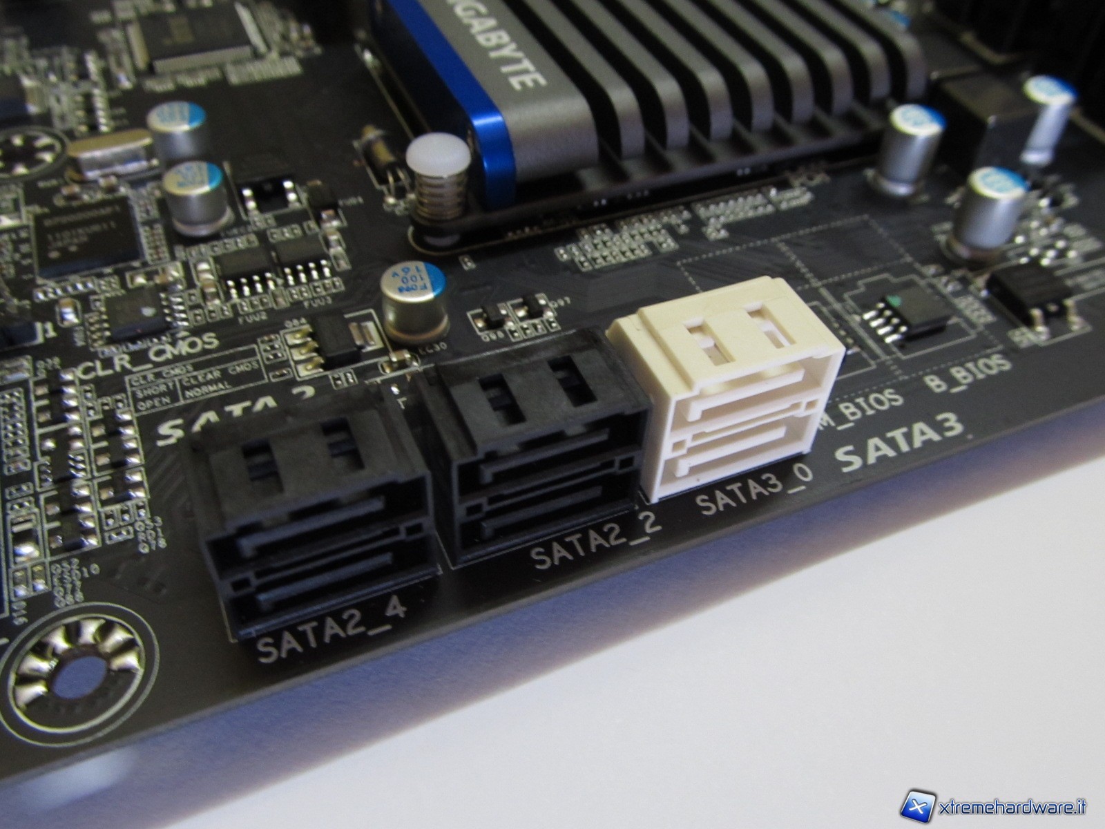 Spostandoci sulla destra, possiamo apprezzare il dissipatore del chipset (Intel P67-B3), il jumper CMOS, le porte SATA e le connessioni relative al case; nella seconda fotografia possiamo evincere che le porte SATA di colore bianco sono destinate alle connessioni SATA 6Gb/s mentre quelle nere sono concernenti le connessioni SATA 3Gb/s.