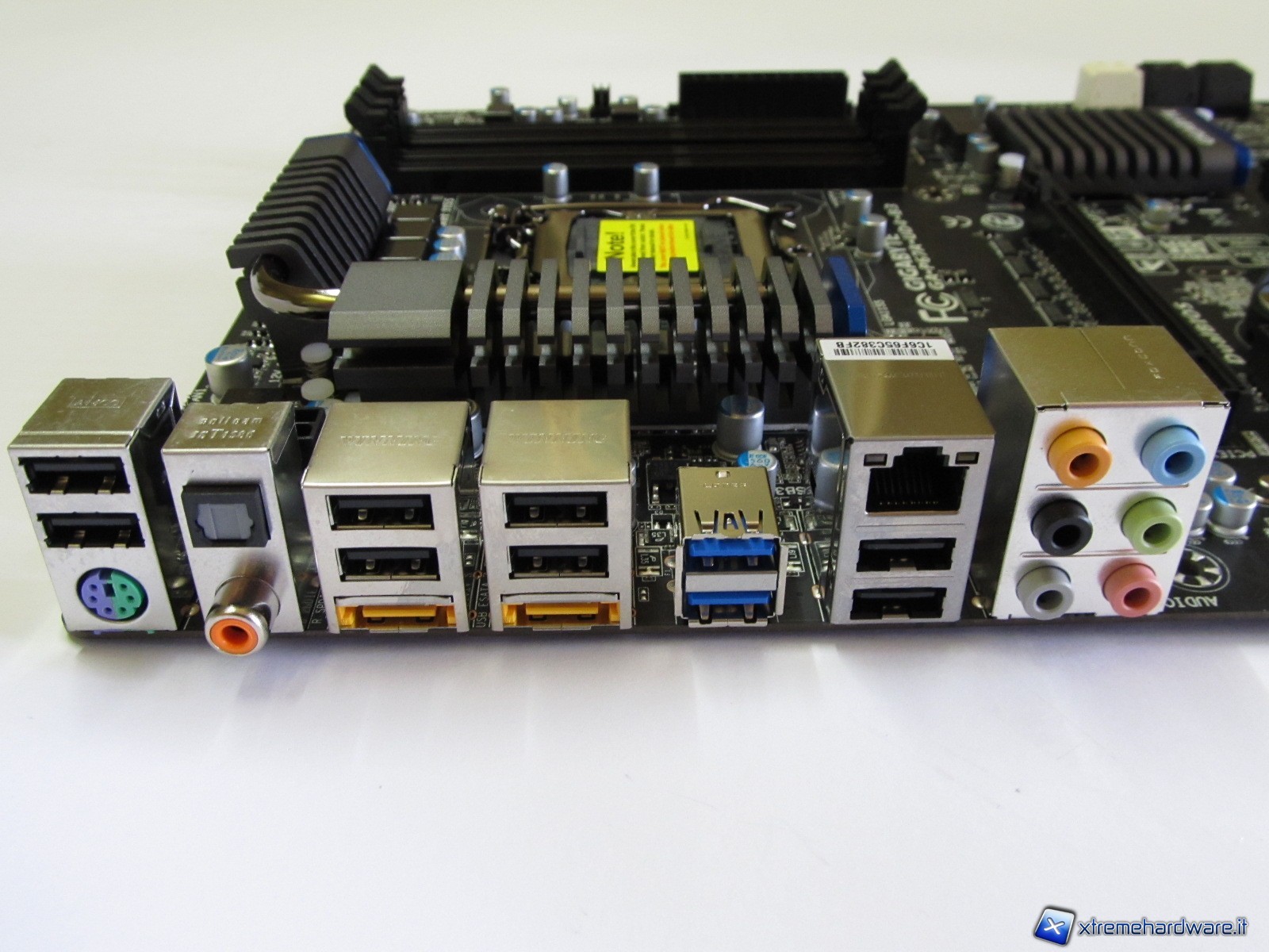 A questo punto passiamo alla parte relativa al pannello I/O posteriore, dove scorgiamo ben otto porte USB 2.0, due USB 3.0, una porta PS/2 ibrida per mouse e tastiera, due connessioni eSATA, due uscite SPDIF (una coassiale e una ottica) e i sei canali dedicati al sistema audio integrato.