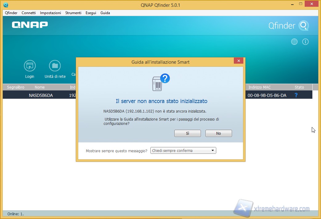 Tale programma ci avvisa immediatamente che il NAS trovato non è ancora stato inizializzato e chiede di eseguire questa operazione.