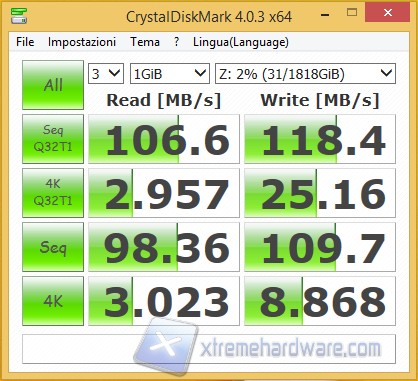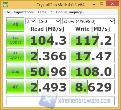 I risultati mostrano valori elevati, che sfiorano i 120MB/s in scrittura e vanno oltre i 100MB/s in lettura.
